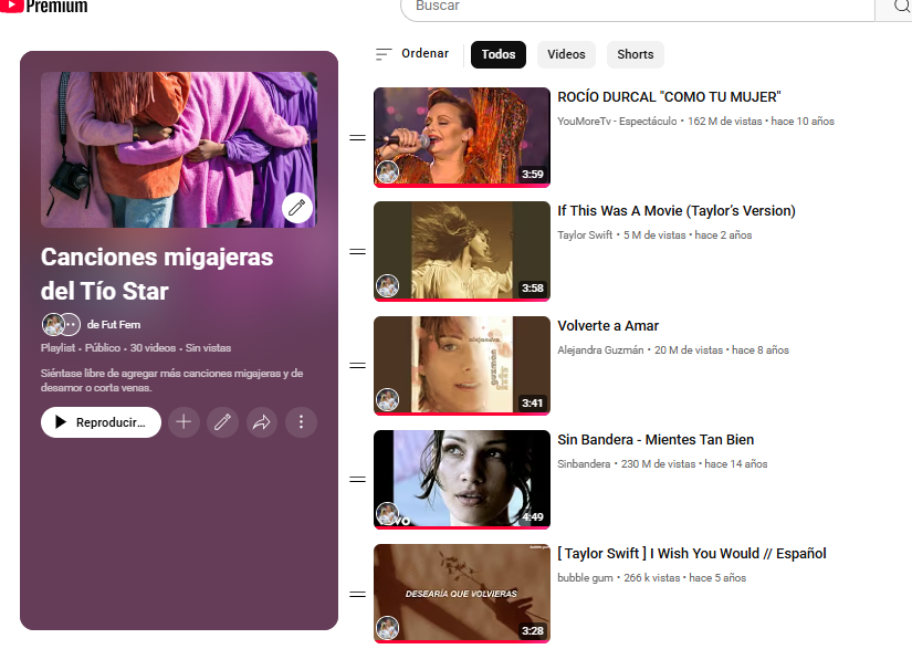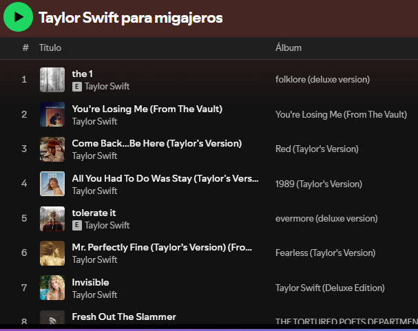Vean esta lista, the 1 la número uno en la playlist que lleva un buen nombre, ‘Taylor Swift para migajeros‘ ¡Zaz! Hay de todas las eras, eh. Jaja. Qué valioso es tener en imagen estas muestras para saber qué tanto nos hemos dejado llevar y conducir por las migajas de amor —o desamor—con las que nos conformamos. Digo, suponiendo que sea tu caso como el mío. El link de esta playlist aquí.