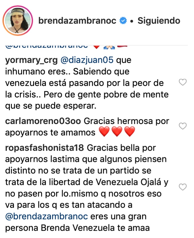 “VENEZUELA ?? ?? ESTA CON USTEDES ???? #venezuelalibre✨ mucha fuerza”, escribió Brenda Zambrano en el pie de foto
