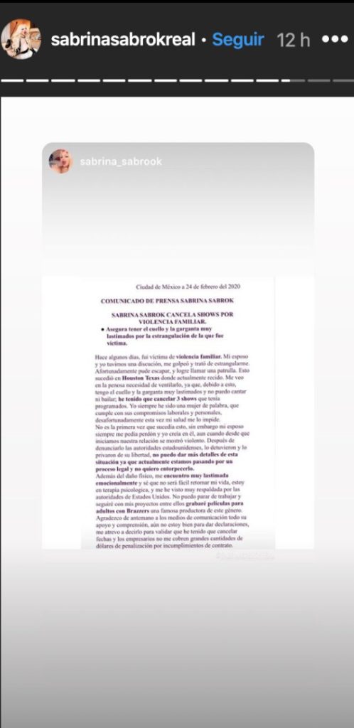A través de sus historias de instagram Sabrina argumentó que debido a la violencia, su esposo la dejó incapacitada para cumplir con sus compromisos laborales.