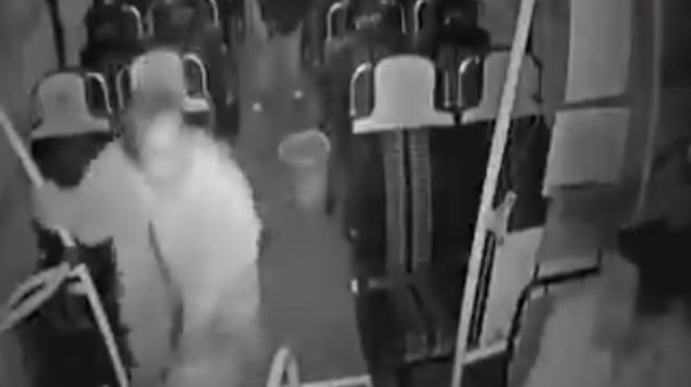 La grabación muestra al chofer terminar su ruta, se escucha la música de fondo, las luces apagadas, sin embargo, una mujer camina hasta la puerta, detrás de ella la sigue un joven con sudadera y audífonos.