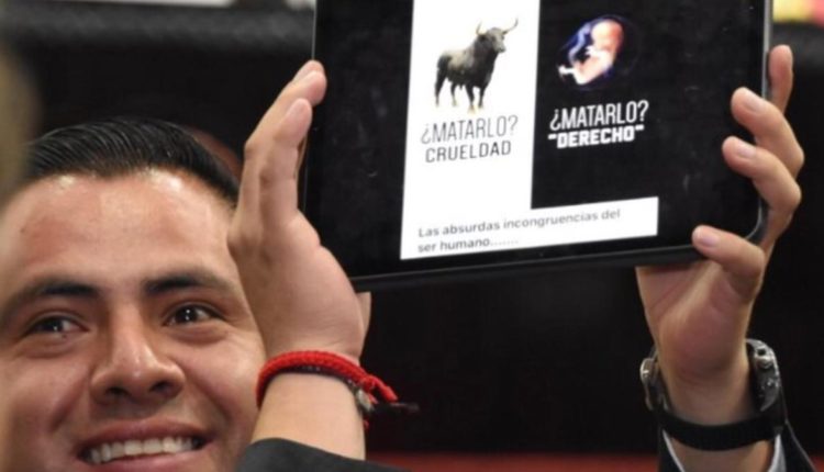 A través de una tableta, el diputado tenía una imagen donde se apreció la leyenda “¿matarlo? Crueldad”, haciendo alusión a un toro, y otra imagen decía “¿matarlo? Derecho”.