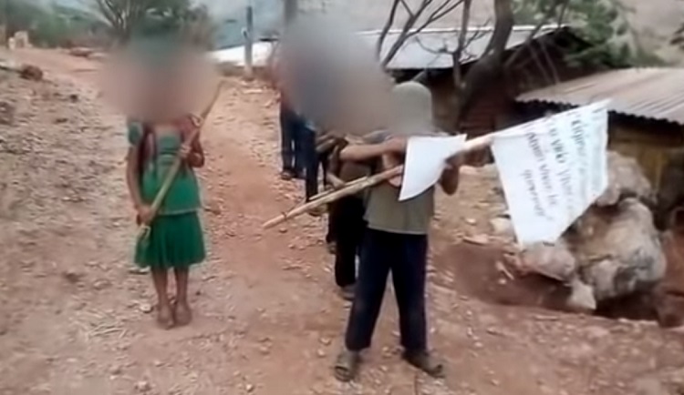 Los menores han sido adiestrados en guerrilla con el objetivo de combatir a los grupos delictivo que amenazan la zona. Uno de ellos porta una bandera que dice: