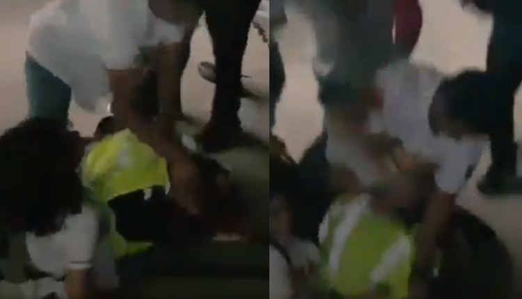 Después el hombre golpea con la cabeza a uno de los policías, que intentan someterlo, pero sus acompañantes lo impiden y agreden a los uniformados.