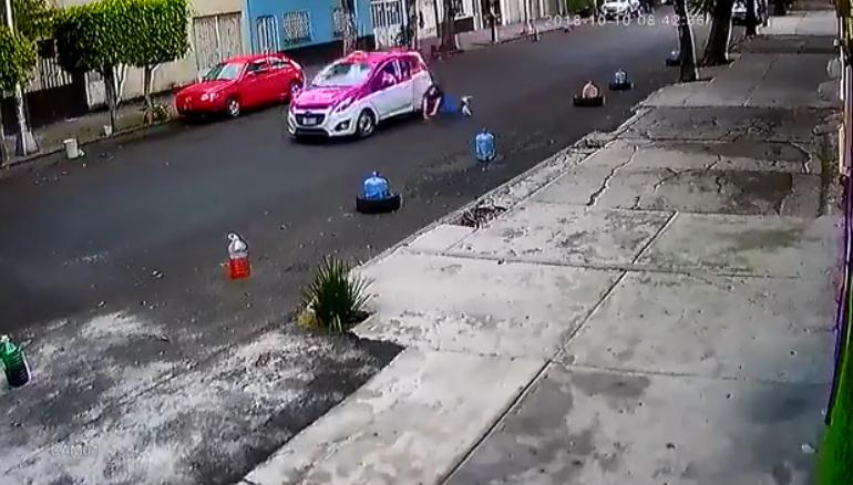 En la grabación que fue obtenida gracias a una cámara de seguridad del vecindario se puede ver cómo una mujer corre desesperada y aferrada detrás de un taxista.