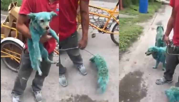 La grabación muestra a los sujetos que transportan en un triciclo con varios perros pintados de verde y cuándo una persona los cuestiona sobre el color de los animales uno respondió.