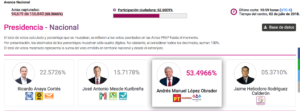 Andrés Manuel López Obrador sigue en primer lugar con un porcentaje entre 53.49%