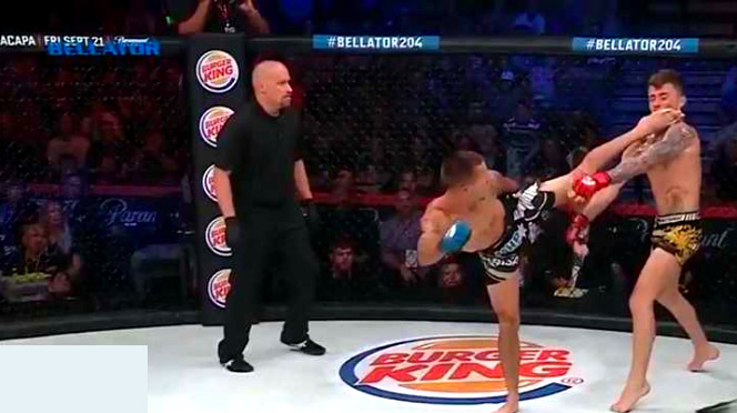 Con un golpe directo al rostro, y poco después una patada en el mismo lugar, James Gallagher fue a dar a la lona para seguir recibiendo golpes en el rostro por el norteamericano Ricky Bandejas.