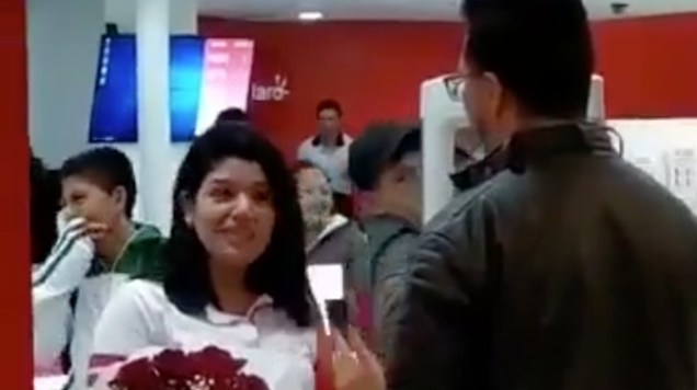 Varias personas se quedaron viendo el romántico detalle, pero la chica, sumamente incómoda, rechazó al joven. Además, luego de hablar brevemente con él, ella dejó el ramo de flores y los chocolates en el piso.