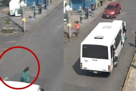 En el video se observa a la mujer de la tercera edad caminar por la calle cuando se atraviesa sin ver que de un lado venía la unidad de transporte público que en cuestión de segundos la atropelló.