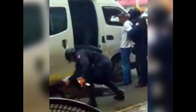 En las imágenes se puede ver a uno de los policías colocar las esposas a un hombre de playera blanca y gorra, mientras que el otro policía golpea y da patadas al cómplice.