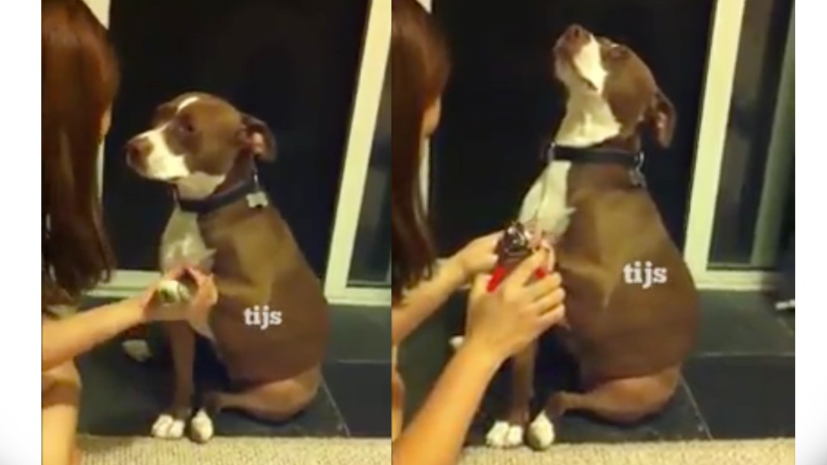 A través de redes sociales circula el video de un perro pitbull que se desmaya cuando le van a cortar las uñas.
