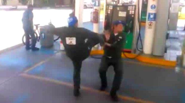 Y es que en un video que se ha vuelto viral, estos despachadores son captados fingiendo que el espacio entre las bombas de gasolina es un ring de luchas.