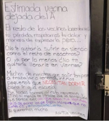 “Estimada vecina dejada del A. El resto de los vecinos lamentamos tu pérdida, respetamos tu dolor y manera de expresarlo pero…¿no te gustaría sufrir en silencio como el resto de nosotros? o ya por lo menos ¿no te gustaría llorarle en viernes? Muchos de nosotros tenemos que salir temprano a trabajar o tenemos niños pequeños que necesitan dormir para ir a la escuela”, le escribió la valiente vecina a la novia dejada.