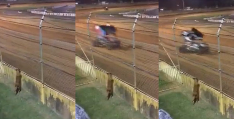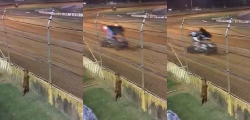 El video grabado en una pista muestra al can posado en muro de contención mientras ve pasar a los autos a gran velocidad.