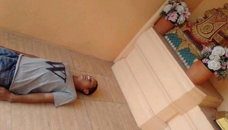 La falsa situación del hombre que fingió su muerte se hizo mucho más real cuando la esposa de Jannwig subió a Facebook una foto de él postrado en el piso y preparado para la ceremonia.